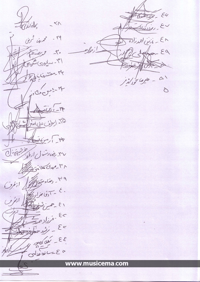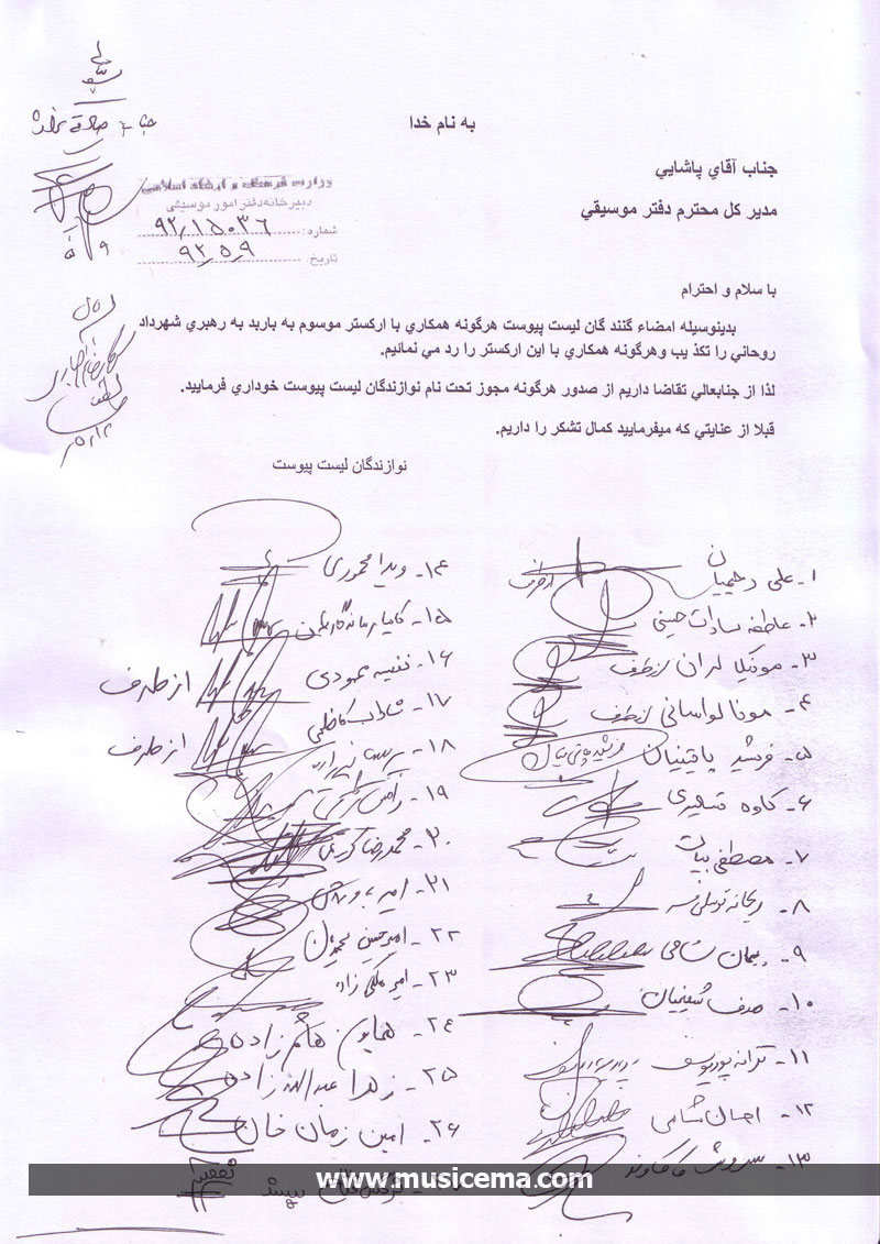 تصویر نامه نوازندهها به مدیر کل دفتر موسیقی را که با تلاش خبرنگار سایت موسیقی ما برای انتشار بدست ما رسیده اینجا ببنید: